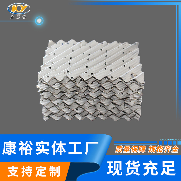 金屬孔板波紋填料(即金屬規(guī)整波紋填料、不銹鋼孔板波紋填料或稱金屬波紋填料)是在金屬薄板孔面打孔、軋制小紋、大波紋后組裝而成,具有阻力小,氣液分布均勻,效率高,通量大,放大效應(yīng)不明顯等特點,應(yīng)用于負壓常壓和加壓操作。